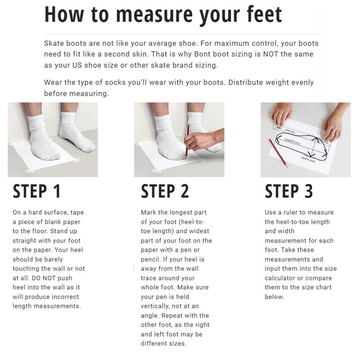 3. Use a ruler to measure the heel-to-toe length and width measurement for each foot. Take these measurements and input them into the size calculator or compare them to the size chart above.