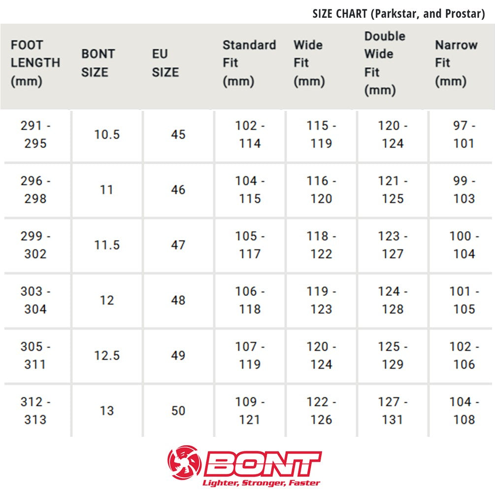 Bont Prostar/Parkstar/Quadstar Roller Skate Size Chart