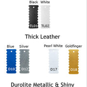 Matte black, matte white, pearl white, metallic silver, shiny gold, matte gold, super yellow, totally lime, purple heart, dreamwash lilac, shiny red, siren red, mega crimson, laser orange, hot pink, cheeky pink, midnight, metallic blue, gamma blue, baby blue, white leather, black leather