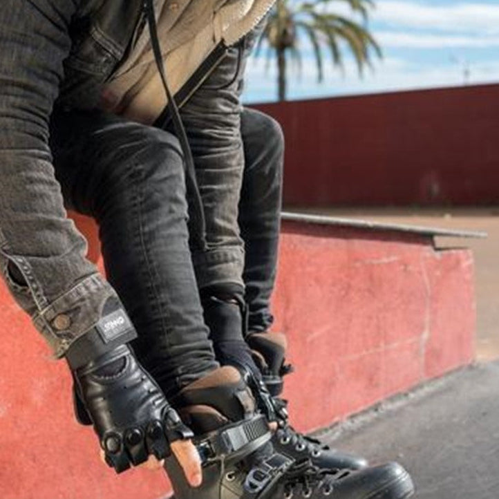 The Ennui Urban Gloves include the anatomical plastic splint for the palm, EVA inserts to protected the knuckles and a long strap that wraps your wrist providing a very unique and soft fit to ensure maximum protection against both impacts and sprains.