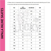 Sizing for Kids: Shoe size and skate size can vary, especially for kids and youths, so please do a foot tracing and measure up before ordering. Check the size chart and if you want growing room you can choose to go up a size or 2 depending on your preference. Many parents underestimate the size they need and buy skates that are too small or they don't account for any growing room. If you have any questions you can also email us for advice on sizing to hello@luckyskates.com.au