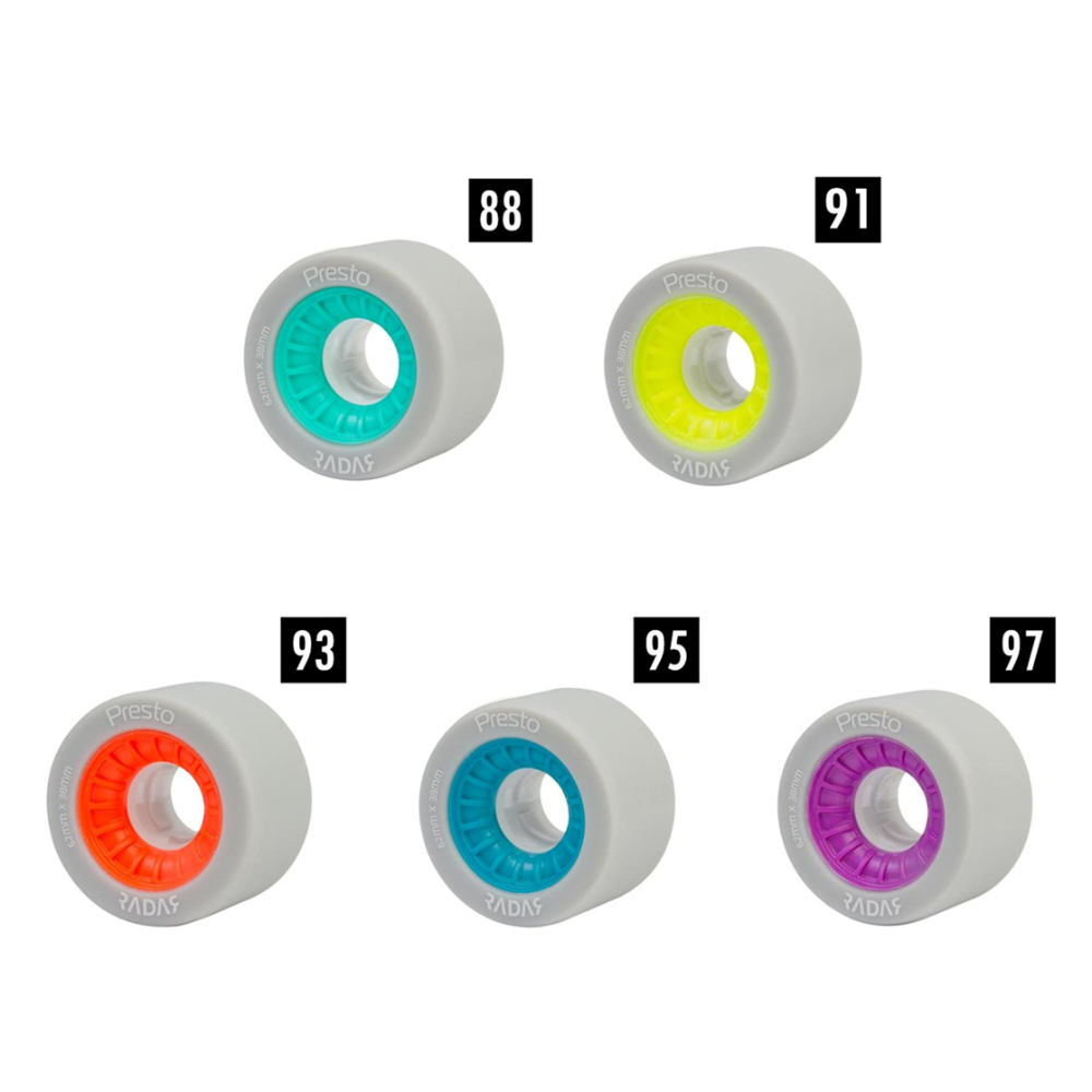- Radar Presto wheels - depending on availability. Choose from 88A, 91A, 93A, 95A, 97A. Or upgrade to Halo wheels for an extra $40 (please put in notes)