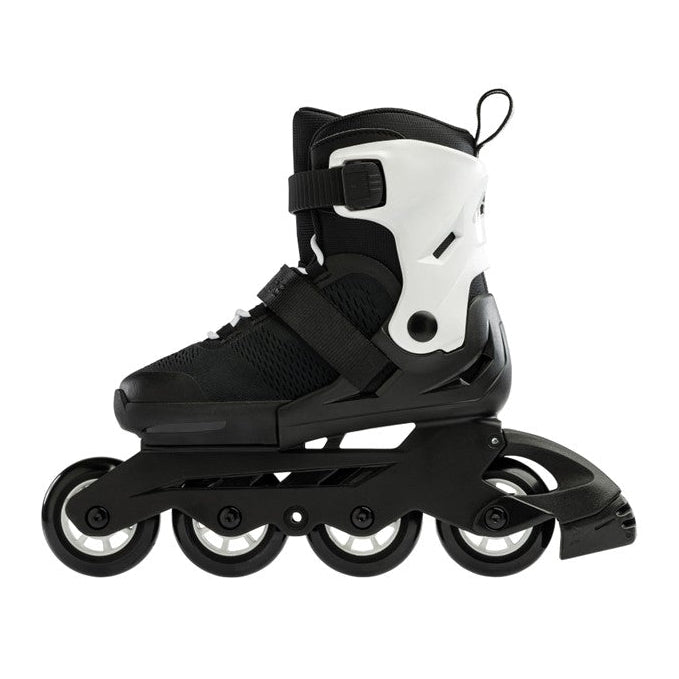 The Rollerblade Microblade model is a high-quality adjustable skate for kids and this neutral black and white colour scheme makes them very easy to style.