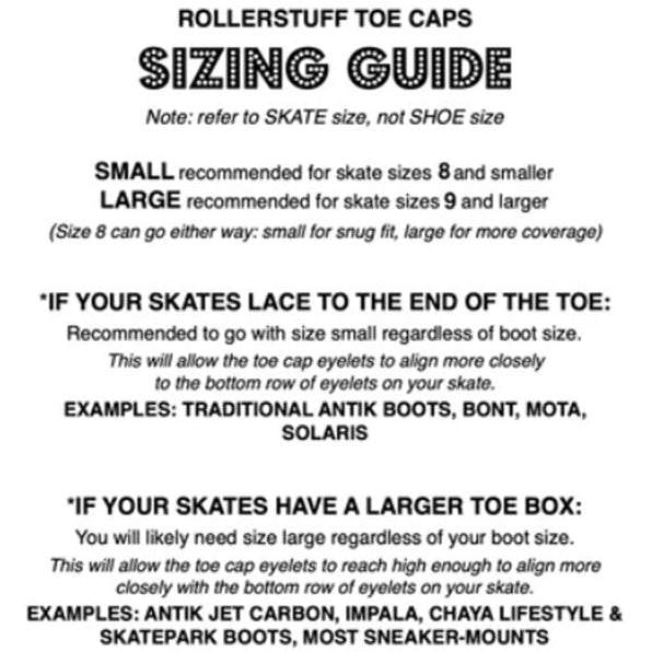 If your skates have a larger toe box you will likely need size Large regardless of your boot size. This will allow the toe cap eyelets to reach high enough to align more closely with the bottom row of eyelets on your skate. For example: Impala Skates, Antik Jet Carbon, Chaya lifestyle boots, Sneaker mounts.