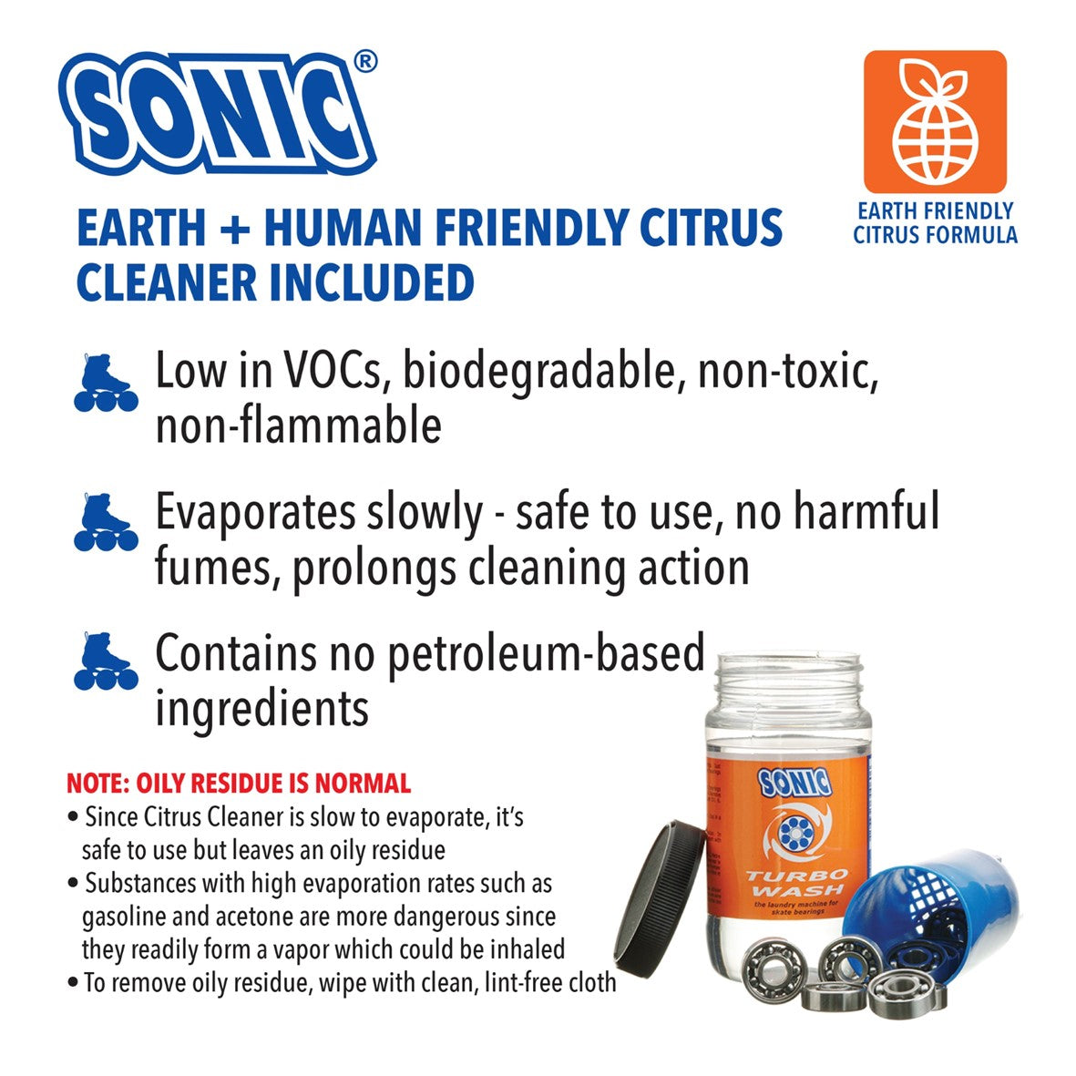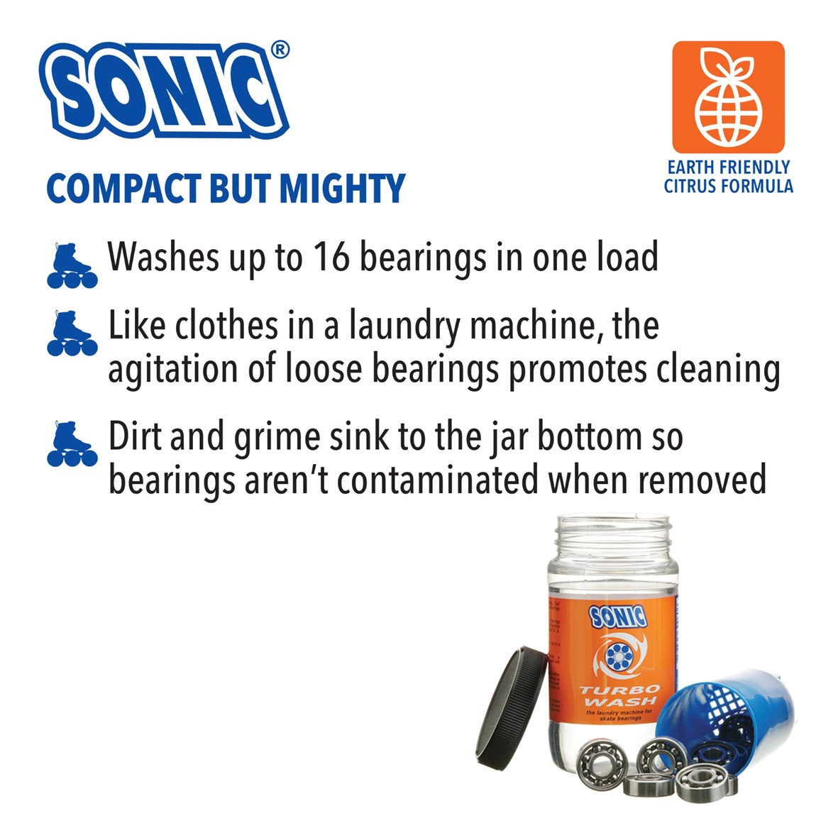 Makes skate bearings shine for a faster, smoother roll with the Sonic Turbo Wash.