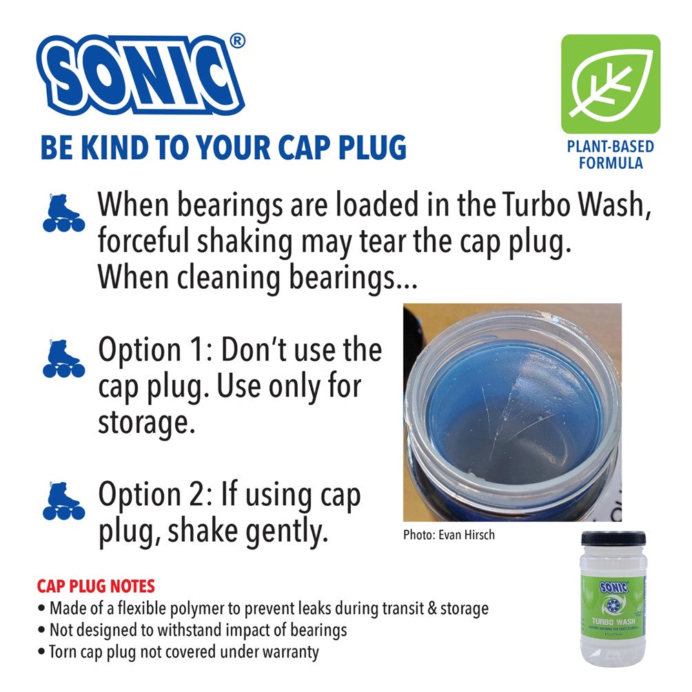 - Cap plug. When bearings are loaded in the Turbo Wash, forceful shaking may tear the cap plug. When cleaning bearings, don't use the cap plug. Use only for storage. The cap plug is made of a flexible polymer to prevent leaks during transit and storage. It was not designed to withstand impact of bearings. Torn cap plug not covered under warranty.