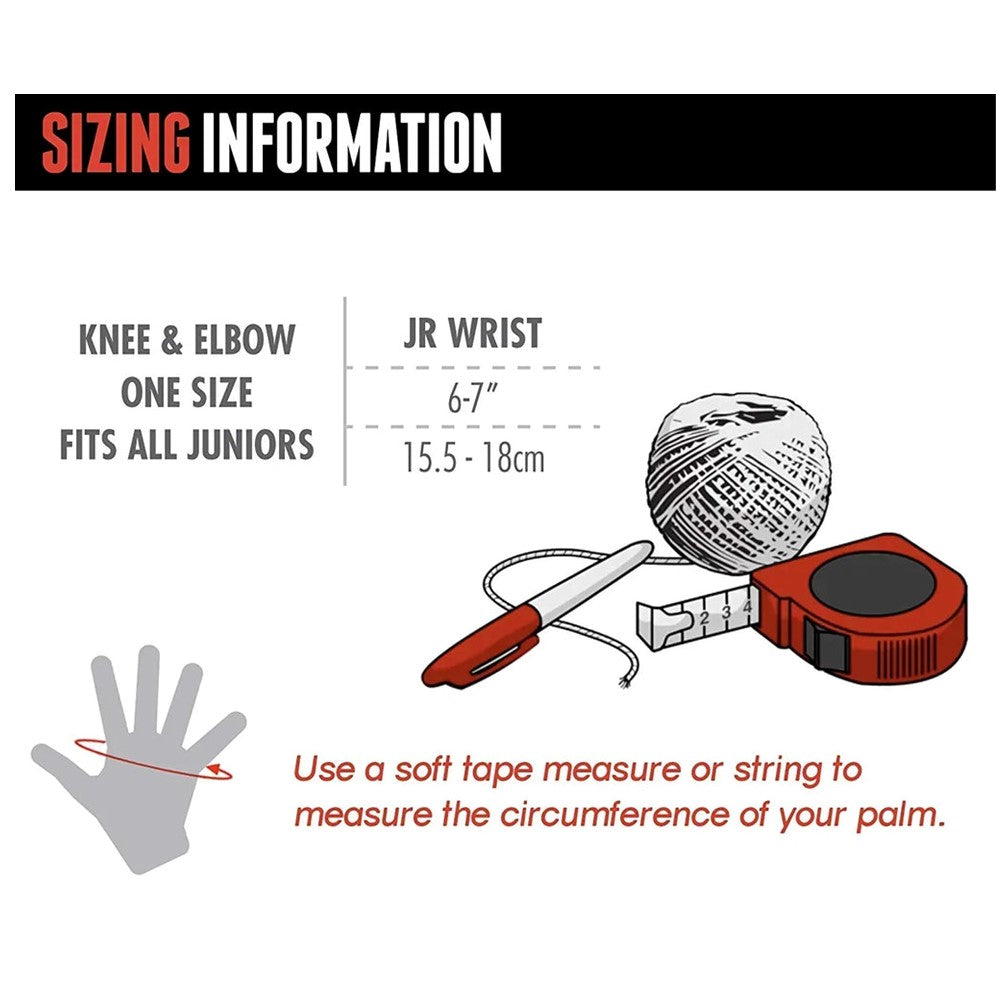 In this pack the knee and elbow are "one size fits most" adults and "one size fits most" juniors. It is based on wrist size.